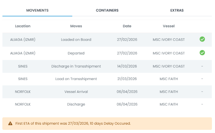 For example, if the first ETA was 23/03/2026 and the shipment’s updated arrival is 06/04/2026, the system will show “10 Days Delay Occurred.”